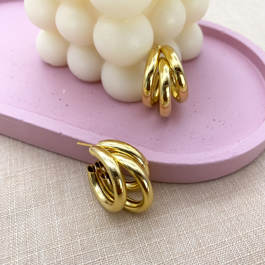 O modelo de argola tripla é um grnade sucesso, pois não depende de um tamanho exagerado para chamar a atenção, possui personalidade e é extremamente elegante. Possui banho e verniz que valorizam o brilho da peça, que além de linda é confortável.